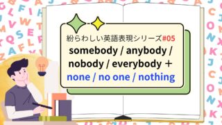 発音・文法トレーニング 紛らわしい英語表現シリーズ05|somebody / anybody / nobody / everybody + none / no one / nothing 【使い分け】somebody / anybody / nobody / everybody + none / no one / nothing を3分で整理「誰か」「誰も」「みんな」など、不定代名詞は英会話でも試験でも頻出。似ているけれど使... 2025.09.25 発音・文法トレーニング
